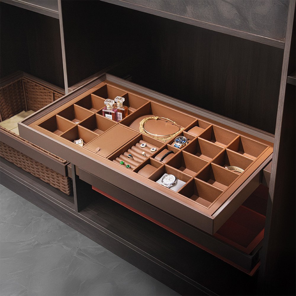 مصنوع بخامات فاخرة وبطانة داخلية مخملية ناعمة تضيف لمسة جلدية أنيقة بلون دافئ، مع آلية سحب ناعمة (Soft-Close) لضمان حركة سلسة دون ضوضاء.