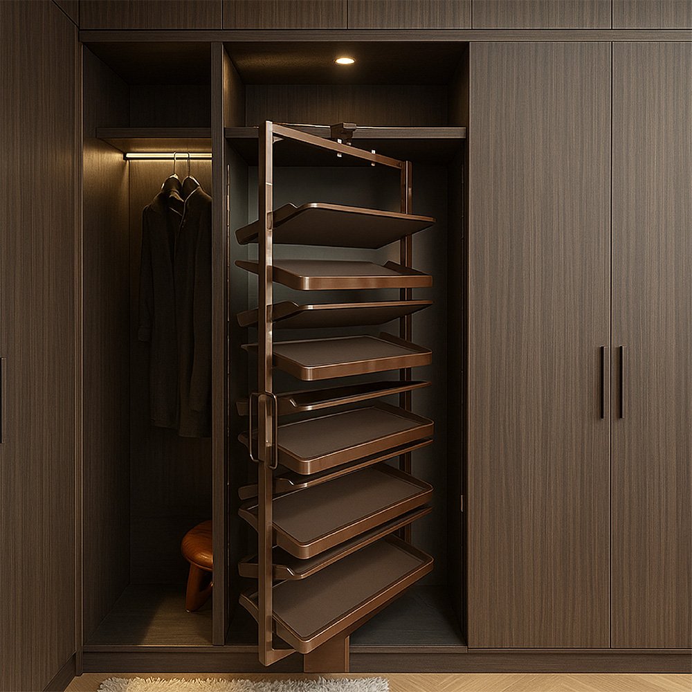 يتميز بتصميم رأسي ذكي بخاصية الدوران الكامل والسحب الناعم، مما يتيح الوصول إلى جميع الأرفف بسهولة دون هدر للمساحة.
